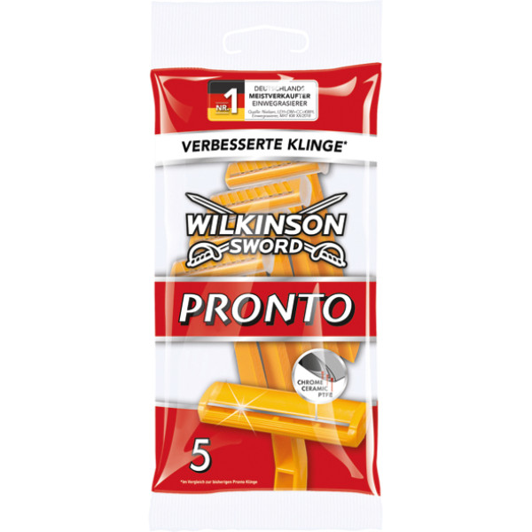 Одноразові станки Pronto з одинарним лезом, які залишаються гострими довше та плавно ковзають шкірою. Технологія — лезо оброблене Teflon (для меншого подразнення шкіри), керамікою (для додаткової міцності) і хромом (для меншої корозії). Така технологія покриття леза забезпечує добрі властивості для гладкого та ретельного гоління. 5 одноразових бритв.