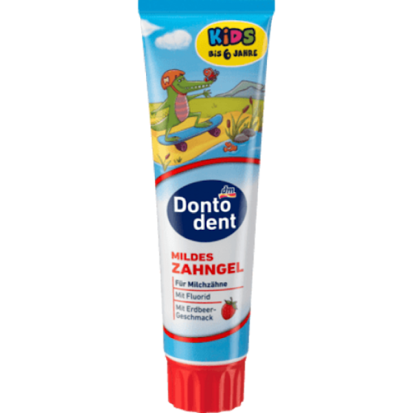Мая зубная паста со вкусом клубники Dontodent для детей до 6 лет была специально разработана для оптимальной защиты молочных зубов. Зубная паста содержит фторид натрия (500 ppm F).