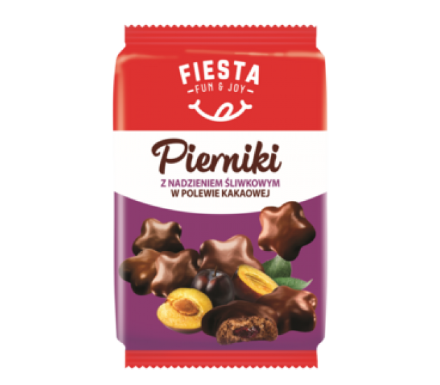 Ось імбирний пряник, яке не знає нудьги – імбирне печиво FIESTA зі сливовою начинкою та какао-глазур'ю 200 г! Воно пахне домашнім святом, має смак нагороди за всі труднощі дня та виглядає неперевершено. Усередині лежить соковита слива, яка сміливо протистоїть солодкості, а зверху виблискує оксамитова какао-глазур. Це ідеальний дует – трохи солодке, трохи фруктове і все це надзвичайно… як імбирний пряник.