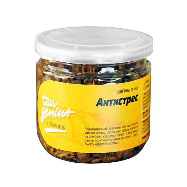 Tea Genius Антистресс – россыпной карпатский чай с успокаивающими свойствами. Имеет светло-коричневый цвет настоя, выразительный травянистый вкус и пряный аромат, который формируют кардамон и кусочки корицы. Обладает расслабляющим, стабилизирующим действием на нервную систему благодаря присутствию ромашки и цедры апельсина. При регулярном применении уменьшает раздражительность и тревожность, не вызывает сонливости. Травяной Ти Джиниус Антистресс – это еще и натуральное противовирусное, противовоспалительное и антимикробное средство. Такие свойства обладают фенхелем, лакрицей и листиками липы, входящими в состав чая. Заваривают настой горячей водой 90°С до 5 минут.