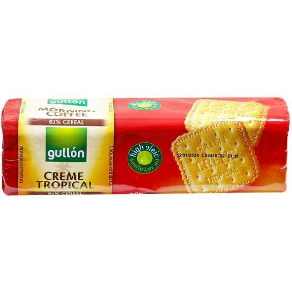Насолоджуйтесь найсмачнішим золотим печивом GULLON Creme Tropical із вмістом злаків 62%. Воно є джерелом клітковини, виготовлене з додаванням олії з високим вмістом олеїнової кислоти.