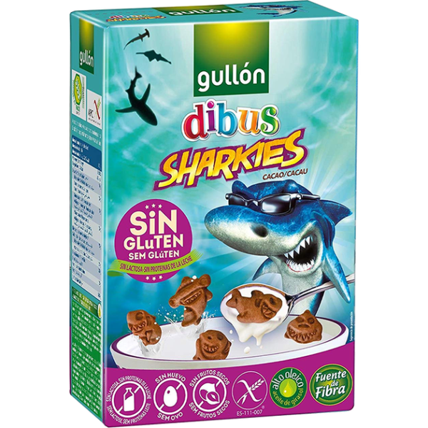 Печиво дитяче без глютену Акули Dibus Sharkies від іспанського виробника ТМ GULLON - ніжне хрустке печиво, яке приємно порадує дитину, а його форма у вигляді акуленят перетворить поїдання улюбленого ласощі в захоплюючу гру!