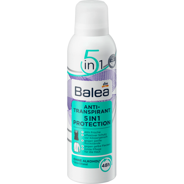 Дезодорант - спрей Balea Anti-Transpirant 5 in 1 пропонує пятуровневую захист від поту і запаху. Дезодорант не залишає слідів і плям на одязі після використання, не викликає роздратування і алергічних реакцій. Підходить для чутливої і нормальної шкіри. Завдяки натуральному складу дезодорант підсилює захисні функції шкіри, запобігає розмноженню бактерій і нейтралізує неприємні запахи, забезпечує тривалий захист і відчуття свіжості, не забиває пори і дозволяє шкірі вільно дихати, дбайливо доглядаючи і живлячи її. Він швидко висихає після нанесення і залишає легкий ароматний шлейф на шкірі, не липкий і легко змивається водою.