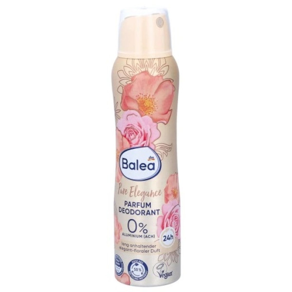 Парфумований дезодорант Balea Pure Elegance балує почуття елегантним квітковим ароматом дикої троянди та пудрового жасмину. Водночас забезпечує ефективний дезодоруючий захист – протягом 24 годин. Формула не залишає білих слідів і забезпечує тривалий аромат.