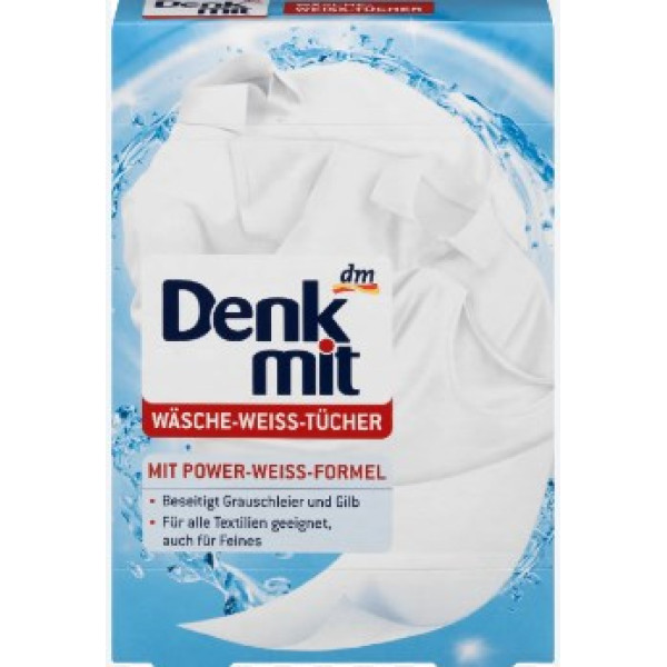 Опис продукту: для відновлення білизни та посивілих тканин; з ефективними інгредієнтами підходить при будь-якій температурі прання; для всіх видів білої білизни, включаючи делікатну. Ганчірки для прання Denkmit для білизни льону повертають яскраву білизну посивілим і пожовклим тканинам. Активні речовини, що містяться в серветках, вивільняються під час прання і повертають білій білизні блиск. Вони підходять для будь-яких температур прання, типів білої білизни, включаючи делікатні тканини.