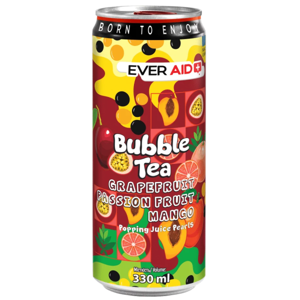 Ever Aid Bubble Tea Grapefruit Passion Fruit Mango - це чайний безалкогольний слабогазований напій з фруктовими соками, доповнений лопаючими кульками. Його свіжий та ароматний смак поєднує солодкість тропічних фруктів з незвичайним ефектом лопаючих кульок, які додають особливу текстуру та насолоду при кожному ковтку.