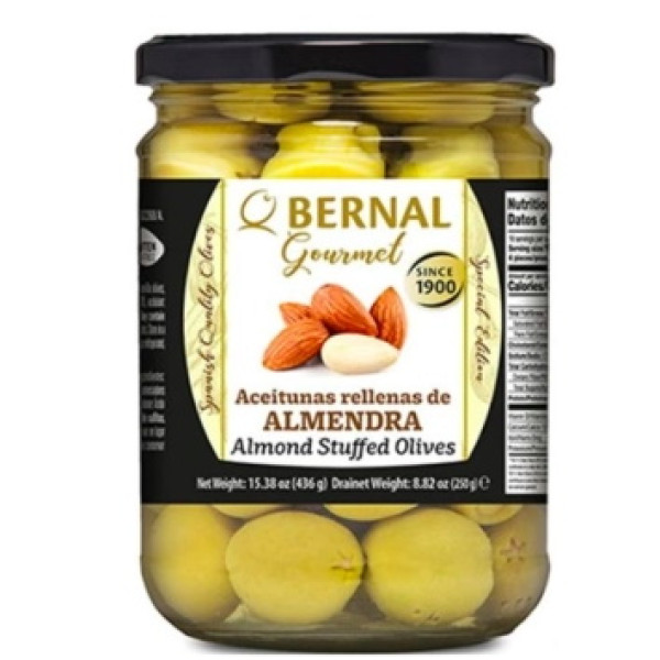 Оливки Bernal з мигдалем — це елегантне поєднання класичних іспанських оливок та хрусткого мигдалю, яке подарує вашому столу незабутній смак і текстуру. Це вишукане поєднання солонуватих оливок з м’яким і ніжним мигдалем ідеально підходить для тих, хто шукає нові смакові поєднання.