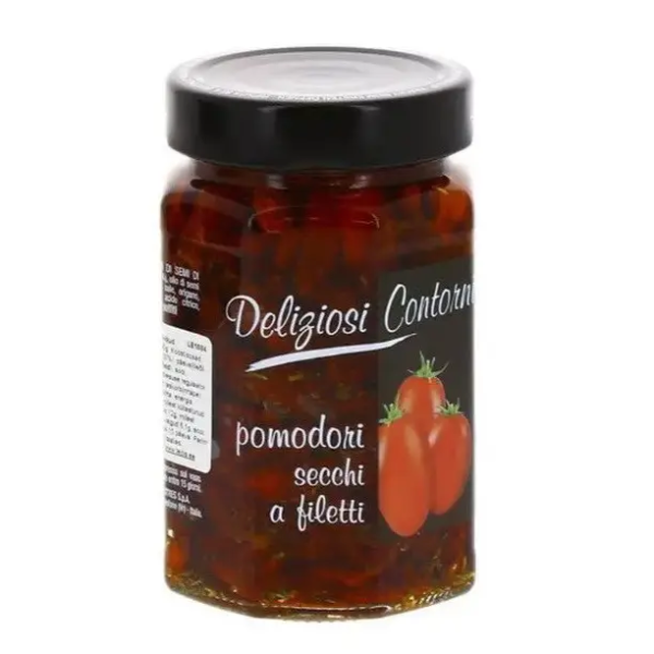 Сушені помідори в олії (помодоро Секки) - натуральний продукт з пікантним смаком, який стане відмінним доповненням до випічки, бутербродів, Брускети, овочевих і м'ясних запіканок. помідори приготовлені по традиційним італійським рецептом і зберігають всі вітаміни і мікроелементи. Пряний смак сушених томатів в маслі відмінно поєднується з усіма видами сирів, рибою і пастою.