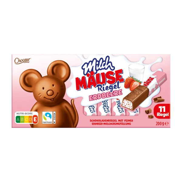 Шоколадні батончики Milch Mause – це смачний та креативний десерт, що поєднує в собі ніжний молочний шоколад і полуничний фруктовий крем. Батончики мають зображення милих мишок, що робить їх особливо привабливими для дітей.