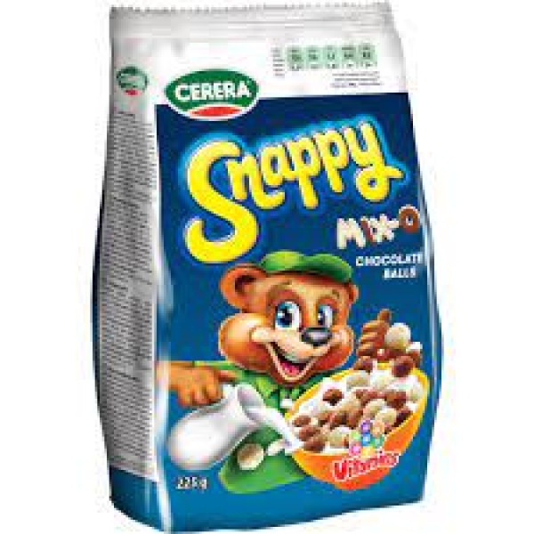 Сухий сніданок Snappy Mix складається з кульок двох видів: какао та білий шоколад. Смачний і ситний Snappy Mix виготовлений із цілих злаків, насичений корисними вітамінами. Завдяки двом типам кульок сніданок перетворюється на гру. Діти люблять готові сніданки Cerera за чудовий смак хрустких кульок, а мами — за його поживність.