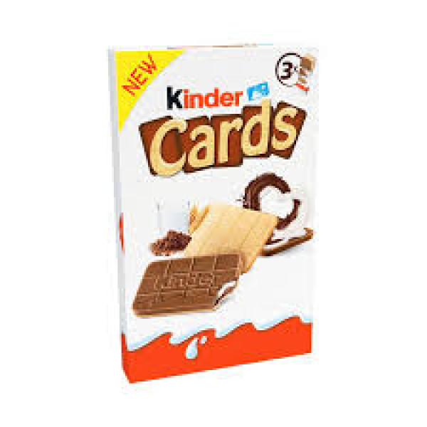 Печиво Кіндер Кардс - Дитячі листівки представляють собою бісквітної - вафельні делікатеси з кремом з ніжного знежирення молока (42%) і кремом з какао (38%). Вироби мають неперевершеним смаком і здатні порадувати, як дітей так і дорослих. У коробці знаходяться 5 штук, індивідуально упакованих пакетів, в кожному з яких по 2 вироби. Така упаковка є дуже зручною, ці маленькі ласощі завжди можна взяти з собою для перекусу