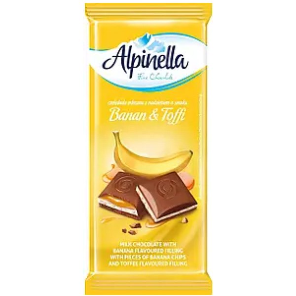 Alpinella Banana & Toffi - польський молочний шоколад, який відкриває в собі ідеальне поєднання вершкового молочного шоколаду, соковитої бананової начинки, хрустких бананових чіпсів і чудової карамелі. Унікальне задоволення для любителів шоколаду! Преміальний імпортний молочний шоколад і щедра бананова начинка з хрусткою банановою крихтою.