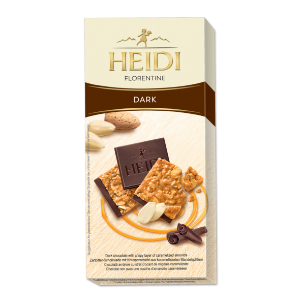 Темний шоколад Heidi Florentine Dark - це вишуканий темний шоколад із смачними хрусткими шматочками мигдалю, облитими карамеллю. За класичним рецептом карамелізовані скибочки мигдалю ретельно розкладають тонким шаром на верхній частині плитки молочного шоколаду.