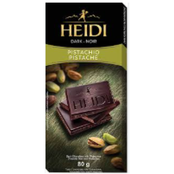 Чорний шоколад Heidi з фісташками — — це вишукане поєднання темного шоколаду та хрустких, ароматних фісташок. Кожен шматочок наповнений насиченим смаком темного шоколаду, який чудово доповнюється ніжним смаком і текстурою фісташок. Шоколад Heidi з фісташками стане прекрасними ласощами для прихильників темного шоколаду та горіхів, додаючи неповторний смаковий досвід і задоволення від кожного шматочка.