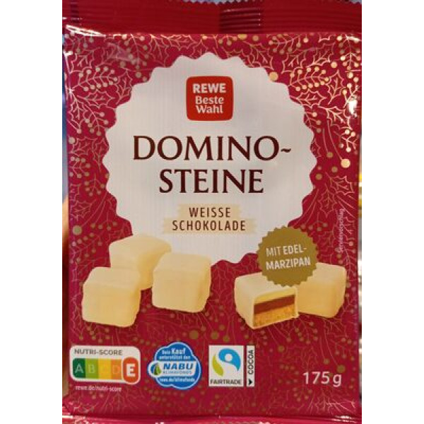 Domino-Steine з марципаном Edel-Marcipan (20%) та білим шоколадом (25%). Склад: цукор, глюкозно-фруктозний сироп, яблучне пюре, пшеничне борошно, какао-масло, мигдаль, сухе незбиране молоко, коричневий цукровий сироп, вода, інвертний цукровий сироп, пшенична манна крупа, житнє борошно, карамелізований цукровий сироп, ріпакова олія, кісточки абрикоса, пшеничний крохмаль, спеції, зволожувачі (інвертаза, сорбіт), гелеутворювачі (пектини), емульгатор (соєвий лецитин), розпушувачі (карбонати амонію, карбонати калію), регулятор кислотності (лимонна кислота), натуральний ароматизатор. Може містити сліди інших горіхів та яєць.