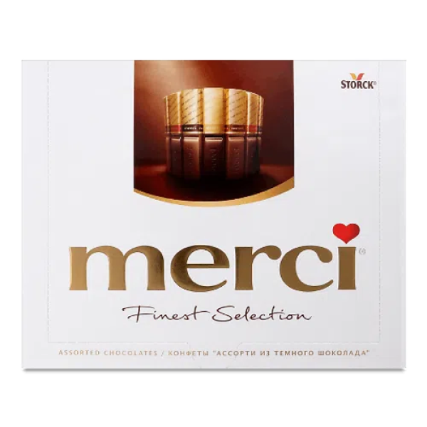 Солодощі Merci виробляються німецькою компанією "August Storck KG", яка по праву вважається одним із лідерів виробників кондитерських виробів на європейському ринку. Вперше народжені в Німеччині в 1965 році, шоколадні цукерки Merci проклали свій шлях до серця людей - врешті-решт ставши першим подарунковим шоколадом, з яким можна по-справжньому сказати спасибі дорогим людям. Merci – асорті з паличок шоколаду з кількома видами начинки в індивідуальній упаковці.