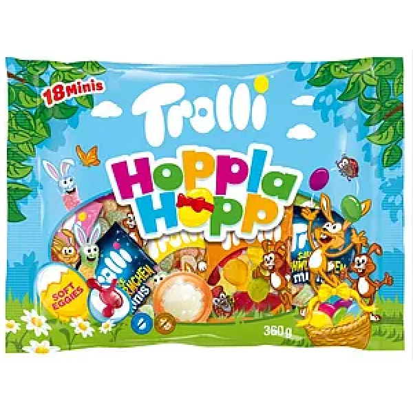 Різноманітність солодких фруктових жувальних цукерок Hoppla Hopp обов'язково має бути в будь-якому крученому гніздечку — для роздавки, прикраси та спільного використання. Милі маленькі кролики, кислі міні-яйця, кислі світлячки, індивідуально упаковані яйця та мотиви кроликів і, як особлива розвага Троллі, барвисті 3D-яйця з пінопластового цукру зі смачною начинкою. Завдяки цій комбінації пошуки базового гнізда будуть щедро винагороджені.